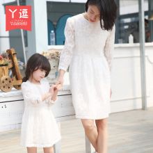 丫逗童装女童亲子装连衣裙2016秋装韩版母女装公主裙纯色圆领套头童装裙子